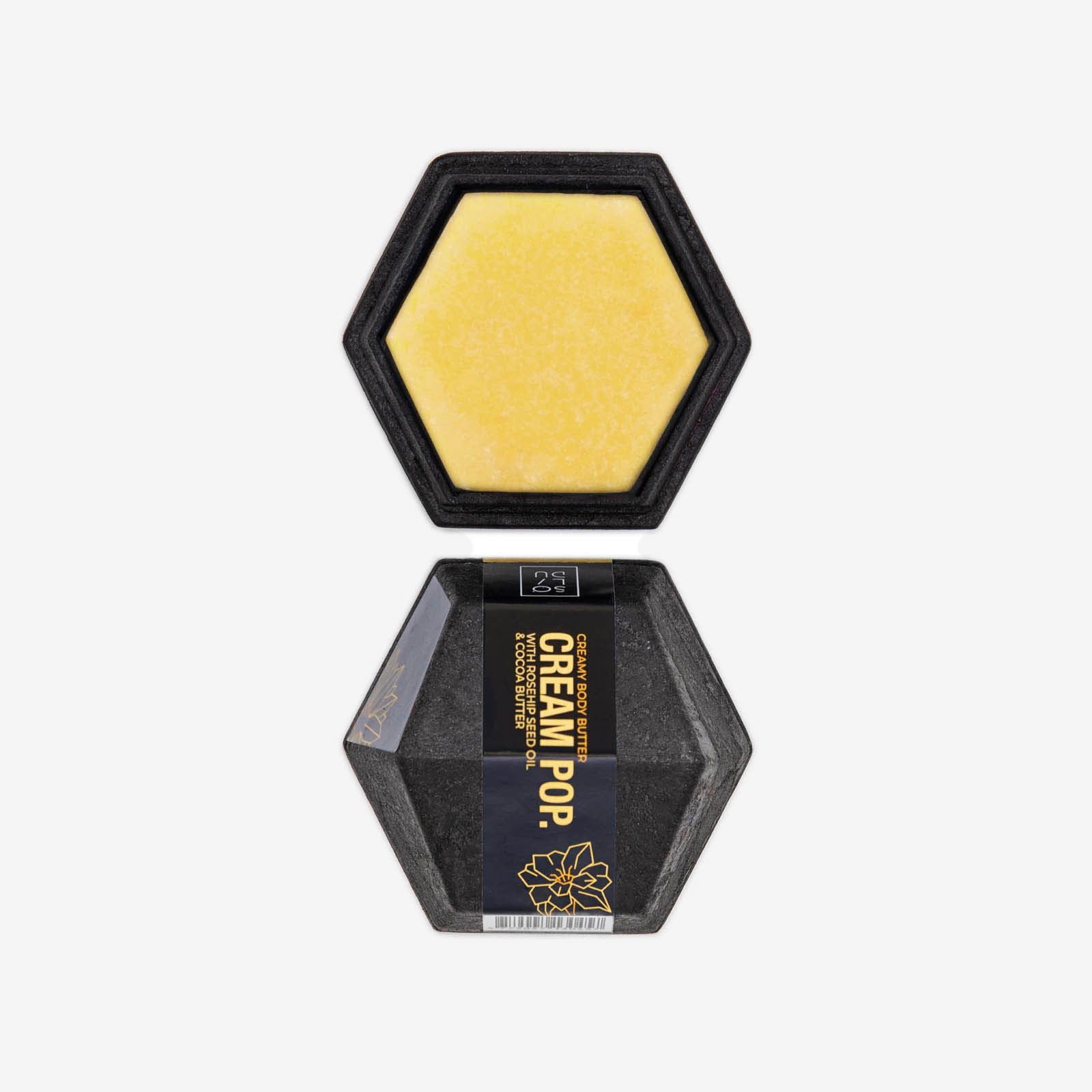 POP to perfection, in every direction! Treat your skin to the comforting nourishment of CREAM POP. With cocoa butter, rosehip seed oil, and shea butter, this solid body butter provides deep hydration, while being light enough to suit all skin types, from dry to normal to combination or oily. Infused with the uplifting scents of orange, cinnamon, and rosemary essential oils, CREAM POP leaves you feeling refreshed and radiant.