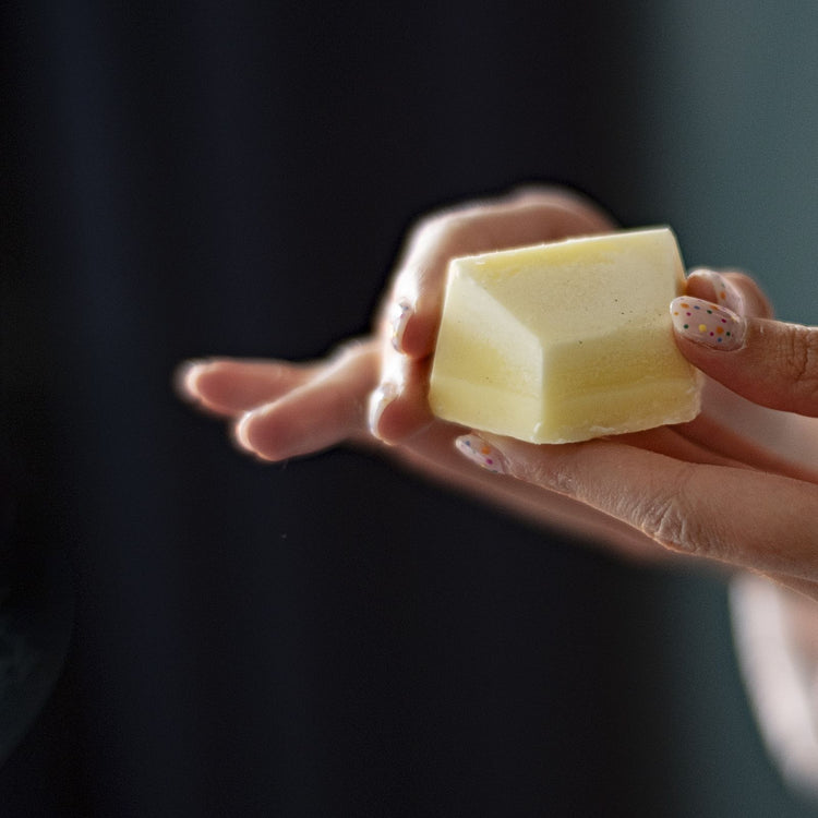 To use solid body butter, start by warming it on your skin after a shower or bath when skin is slightly damp. Gently glide the bar over areas that need extra moisture, allowing it to melt slightly from your body heat. Then, use your hands to massage and spread the melted butter evenly over the skin. Store the bar in a dry, cool place between uses, such as on a luffa or in a cork case, to help it last longer.