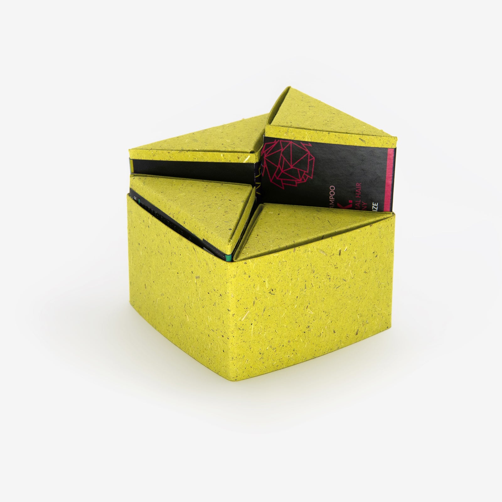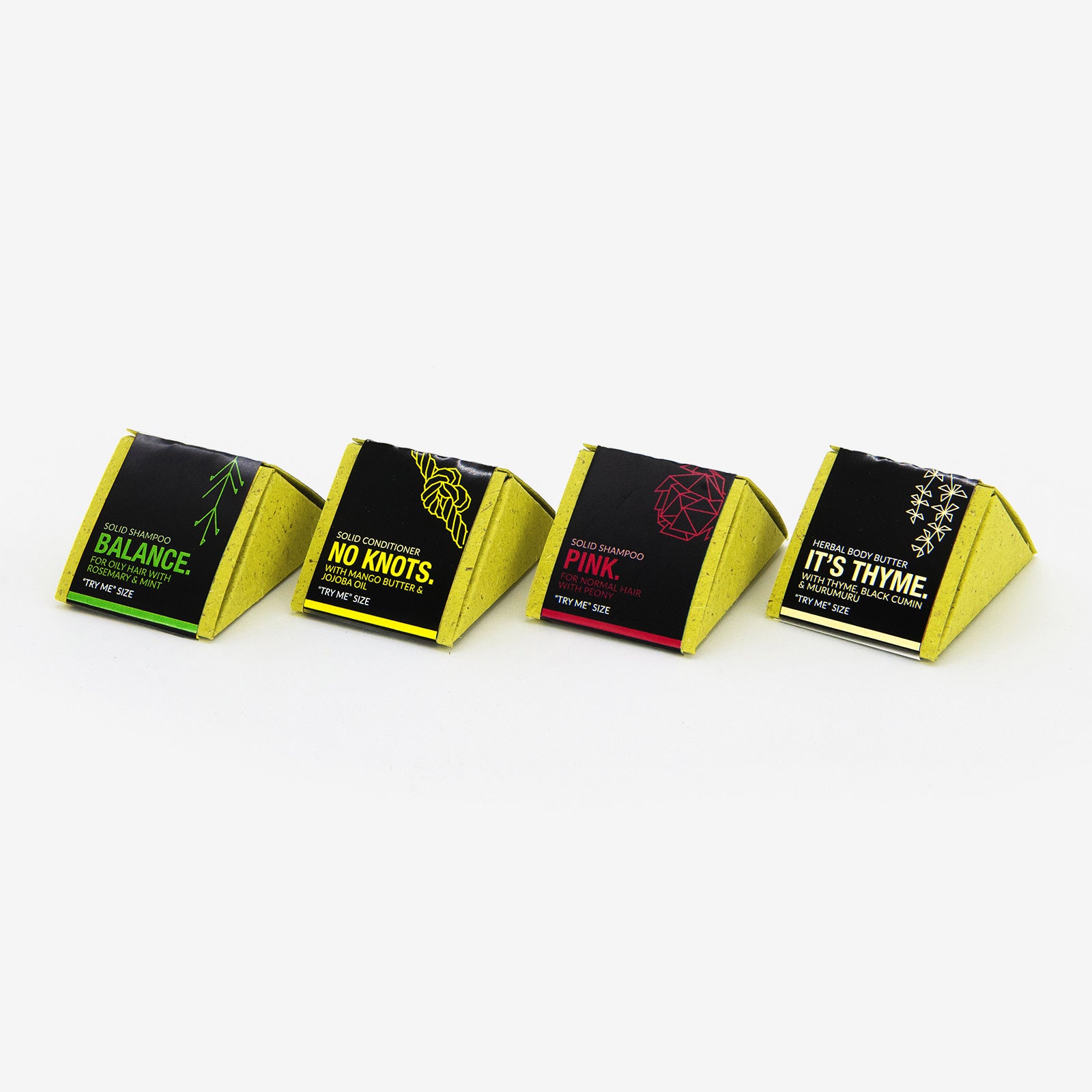"Try-me" size products are packaged in a unique compact box which is made from paper pulp mixed with grass.