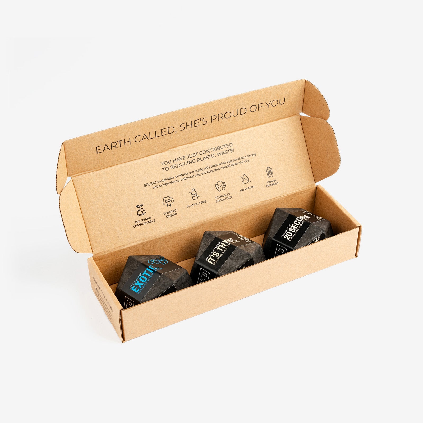 SOLIDU plaukų ir kūno produktai pakuojami į namų sąlygomis kompostuojamas dėžutes: ši pakuotė suyra per 45 dienas nepalikdama jokių atliekų. Tokią pakuotę galite dėti į kompostą arba užkasti žemėje. SOLIDU dezodorantai, kaukės ir lūpų balzamai taip pat neturi jokio plastiko: jie pakuojami į popierines tūbeles.